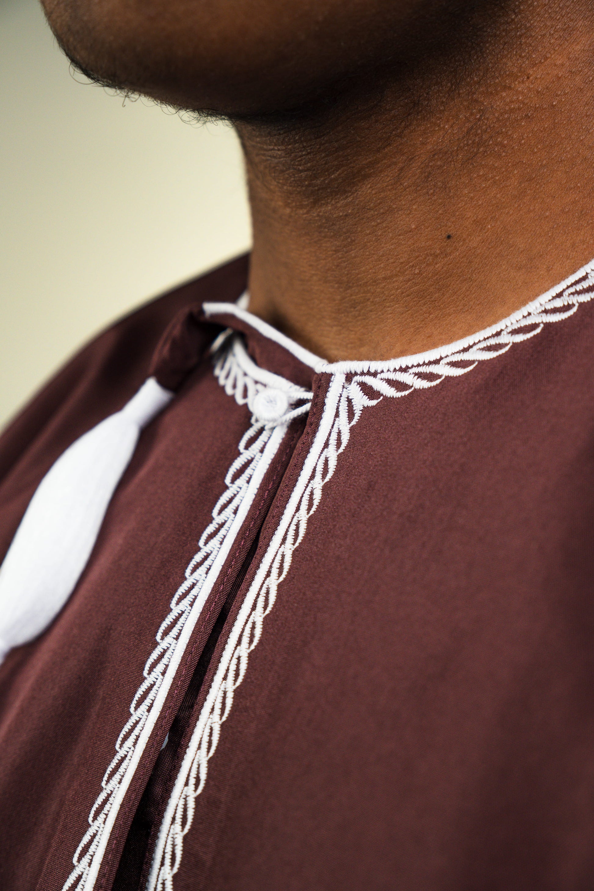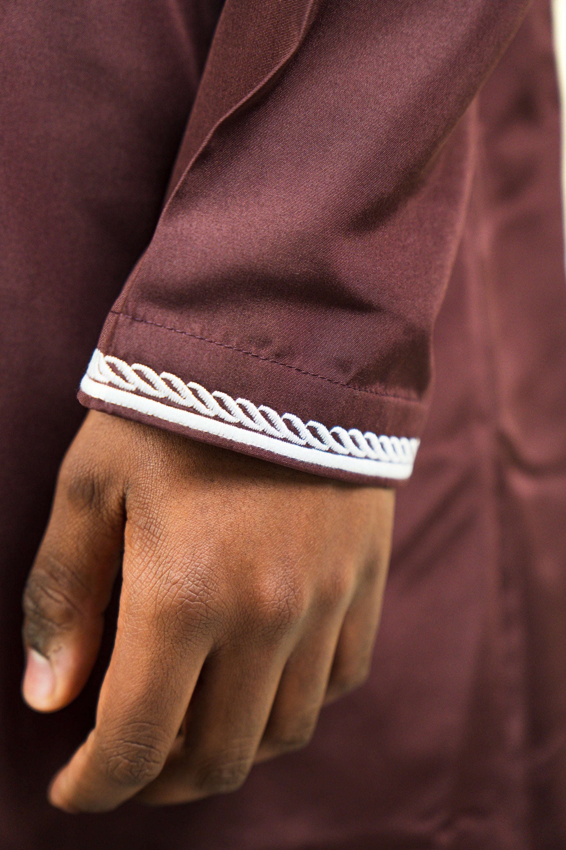 The Burgundy Thobe is crafted in a warm, deep burgundy tone with clean white embroidery. Its balanced colour and minimal finish make it a versatile option for daily wear with a slightly richer presence.